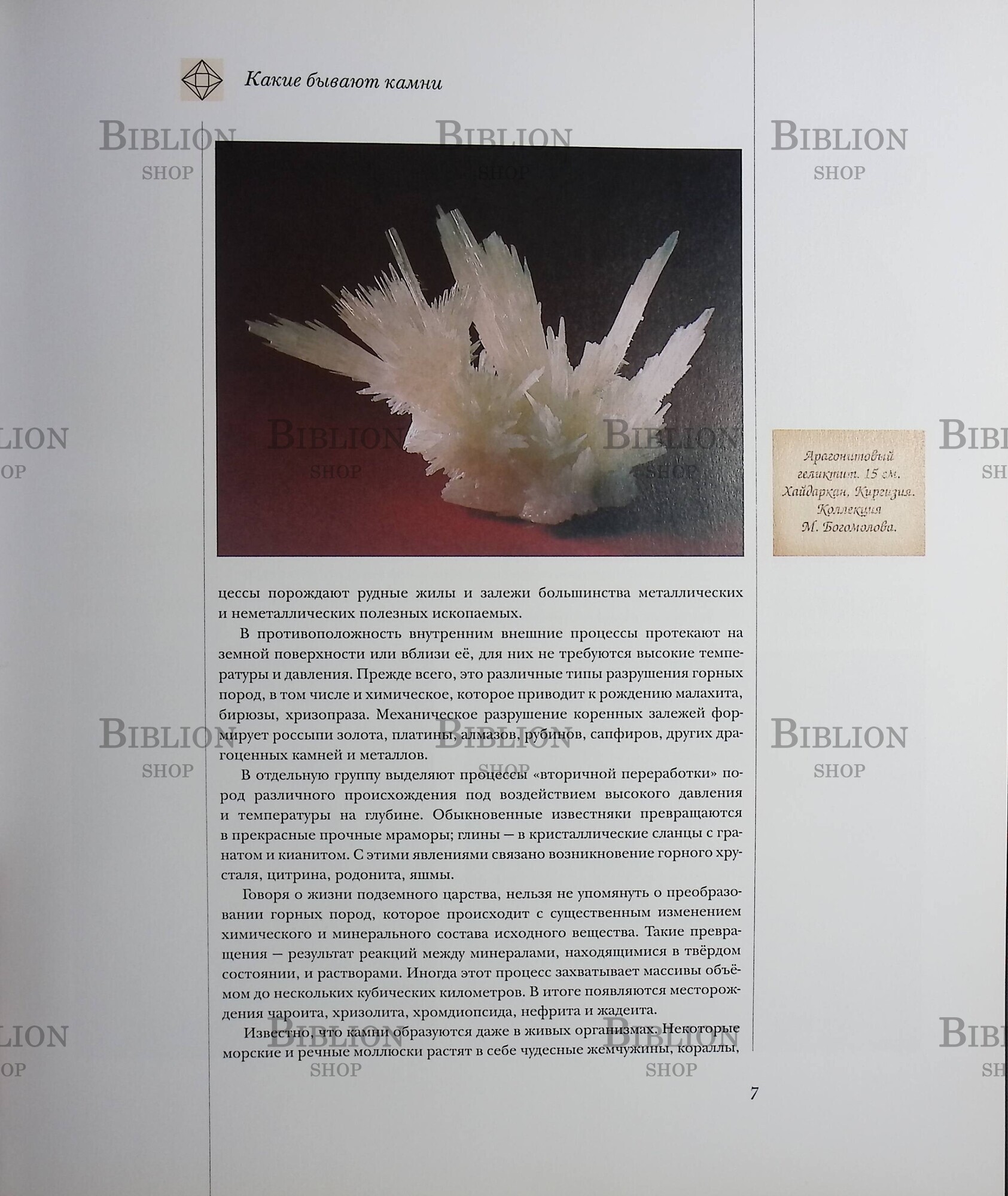 В издательском иллюстрированном переплете.От алмаза - символа красоты и твёрдости, до легко разрушающейся бирюзы - все самые красивые камни мира собраны в одной книге. Фотографии уникальных образцов минералов и пород со всего мира из собраний известных коллекционеров, лучших музеев сопровождают увлекательные рассказы о них - от истории и легенд до их свойств и месторождений. Книга может служить справочником, определителем минералов, прекрасным подарком. Интересующиеся минералогией и любители камня найдут в этой прекрасной книге классификацию, диагностические признаки, удивительные оптические эффекты, сведения о целебных и магических свойствах минералов, побывают в "кунсткамере" природы - собрании чудес каменного царства, узнают о ярмарках камней, о знаменитых коллекциях и коллекционерах. Среди авторов - сотрудники геологических институтов и музеев, коллекционеры, для которых любовь к камням превратилась в дело их жизни.