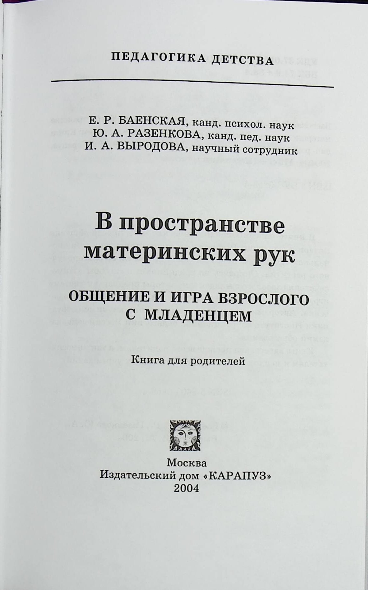 В пространстве материнских рук. Общение и игра взрослого с младенцем (Книга для родителей), Баенская Е.,Разенкова Ю.