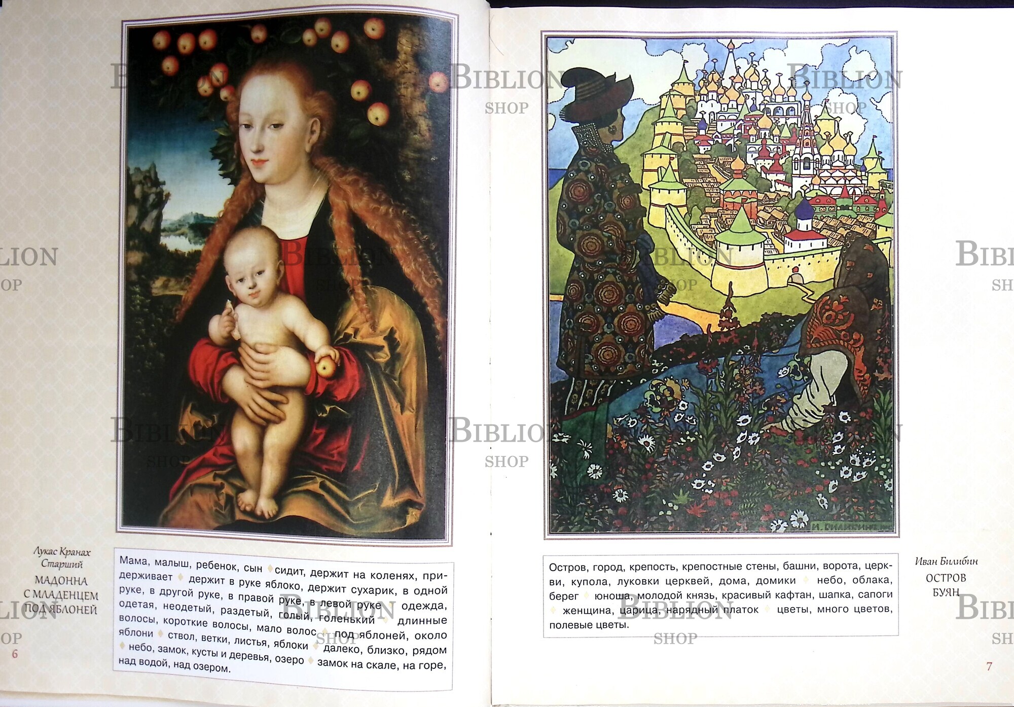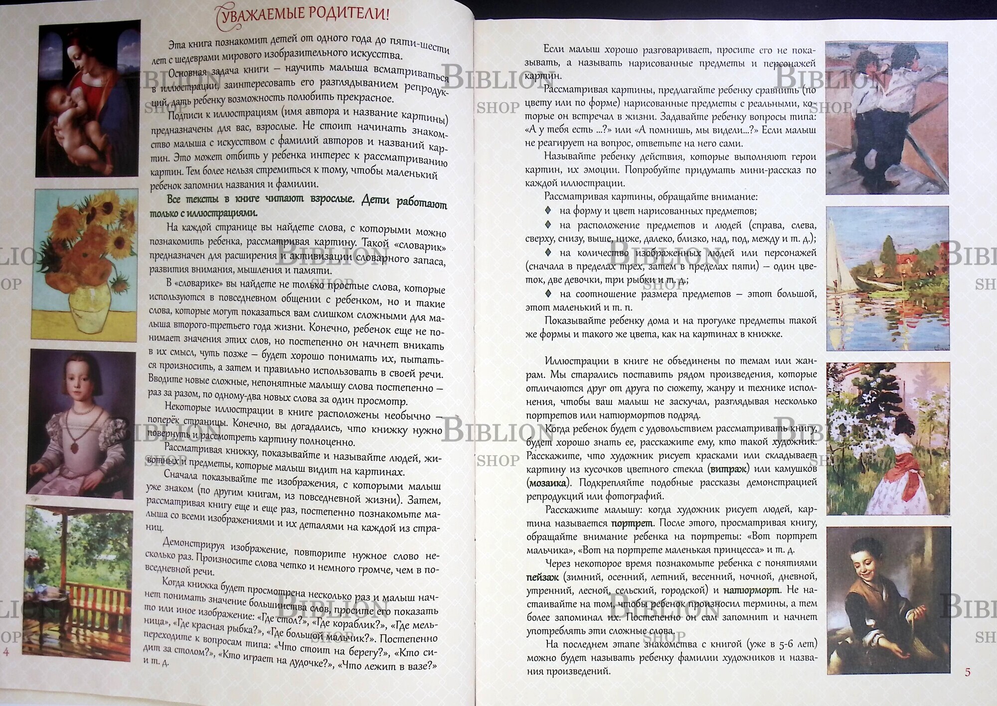 Эта книга для малышей от одного года до 5-6 лет. Она познакомит малышей с шедеврами мирового изобразительного искусства. Основная задача книги - научить ребенка всматриваться в иллюстрации, заинтересовать его разглядыванием репродукций, дать ребенку возможность полюбить прекрасное. Внизу каждой страницы есть "Словарик" - список слов, с которыми можно познакомить ребенка, рассматривая данную репродукцию или фотографию. "Словарик" предназначен для расширения и активизации словарного запаса, развития внимания, мышления, памяти.