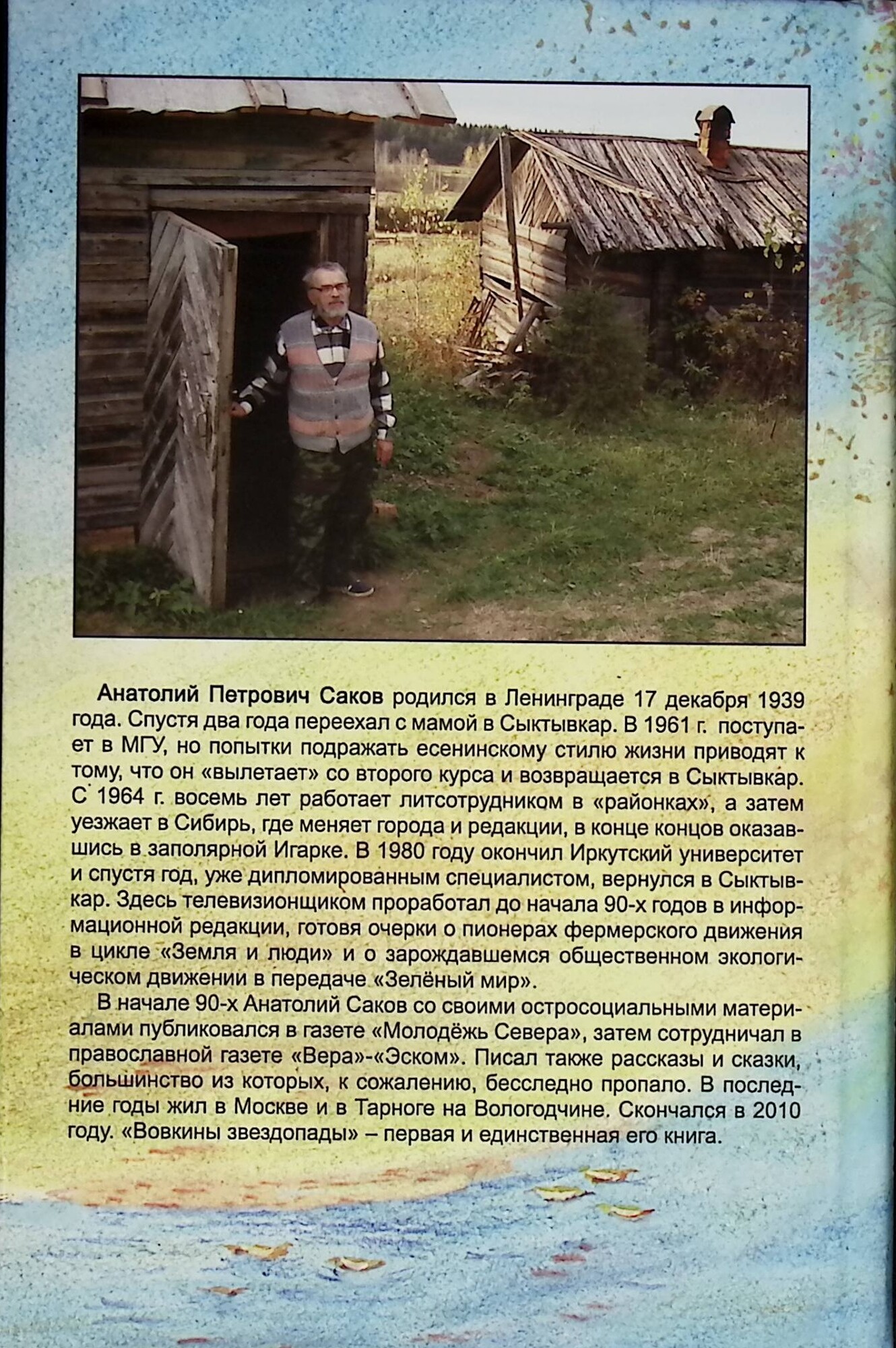 В начале 90-х Анатолий Саков со своими остросоциальными материалами публиковался в газете «Молодёжь Севера», а затем сотрудничал в православной газете «Вера»-«Эском». Писал также рассказы и сказки, большинство из которых, к сожалению, бесследно пропало. В последние годы жил в Москве и в Тарноге на Вологодчине. Скончался в 2010 году. «Вовкины звездопады» — первая и единственная его книга.