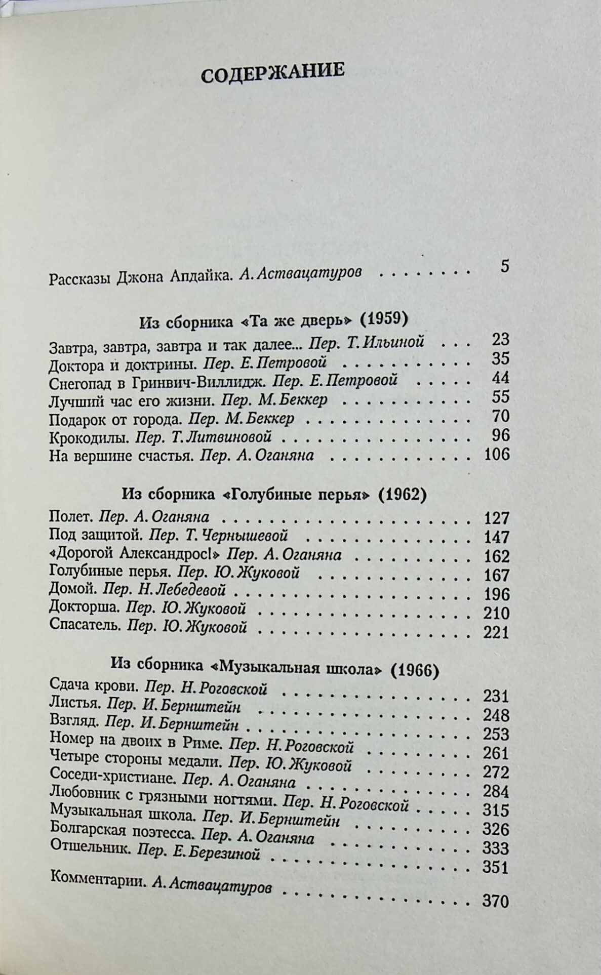 Джона Апдайка в Америке нередко называют самым талантливым и плодовитым писателем своего поколения. Он работает много и увлеченно во всех жанрах: пишет романы, рассказы, пьесы и даже стихи (чаще всего иронические). В России классик американской литературы известен прежде всего как автор романов "Кентавр", "Ферма", "Давай поженимся" и тетралогии о "Кролике". Настоящее издание ставит свой целью познакомить читателя с не менее интересной и значимой стороной творчества Джона Апдайка - его рассказами. В данную книгу включены рассказы из сборников "Та же дверь" (1959), "Голубиные перья" (1962) и "Музыкальная школа" (1966).
