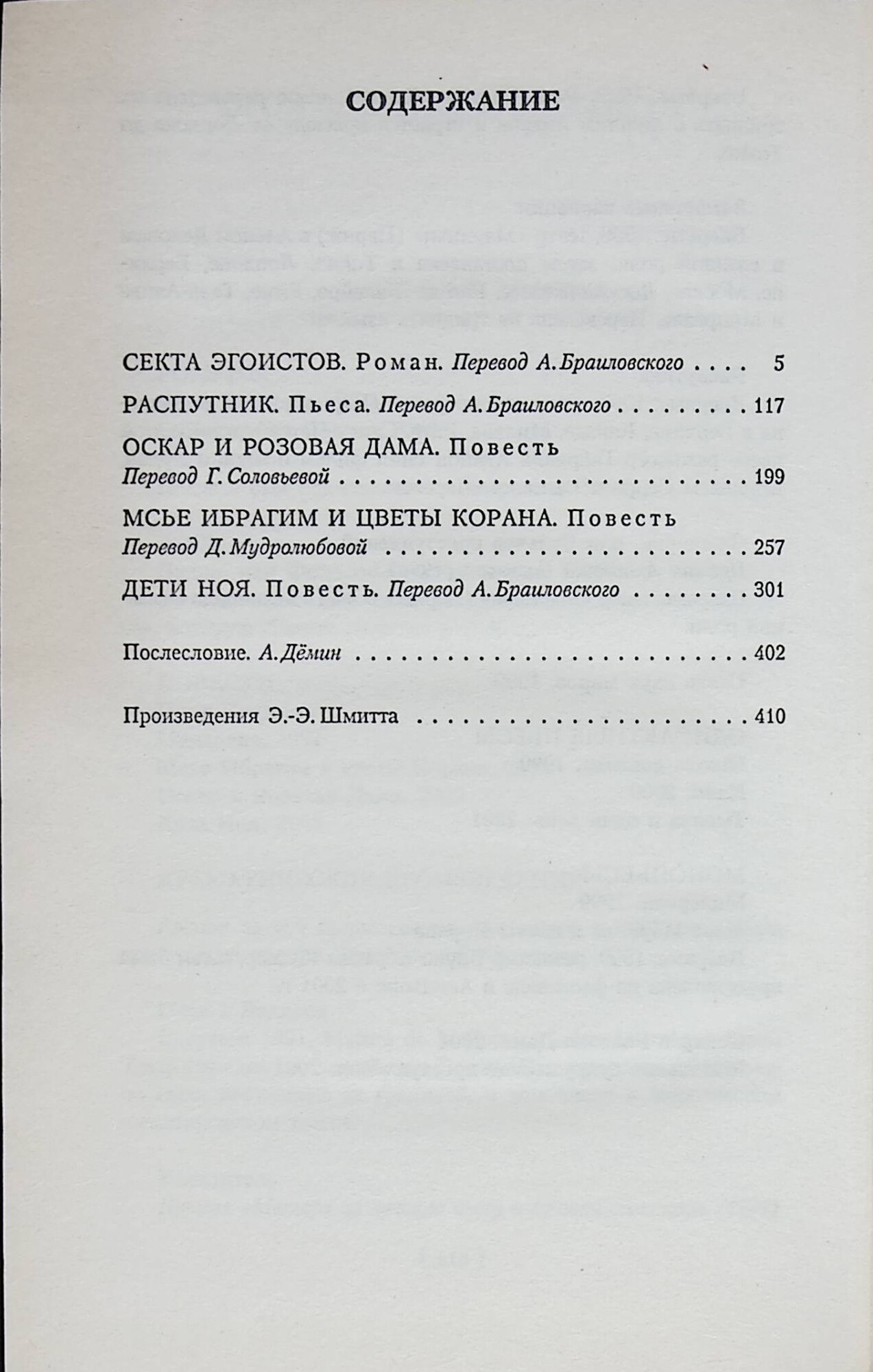 Эрик-Эмманюэль Шмитт - мировая знаменитость, один из самых читаемых и играемых на сцене французских авторов. Это блестящий и вместе с тем глубокий писатель, ставящий фундаментальные вопросы о морали и смысле жизни, о смерти, религии, Боге. В настоящий том включен роман «Секта эгоистов», неподражаемая, остроумная пьеса «Распутник» — один безумный день из жизни Дени Дидро, а также «Оскар и Розовая Дама», «Мсье Ибрагим и цветы Корана» и «Дети Ноя» — три повести, принесшие автору всеевропейскую славу «нового Сент-Экзюпери.