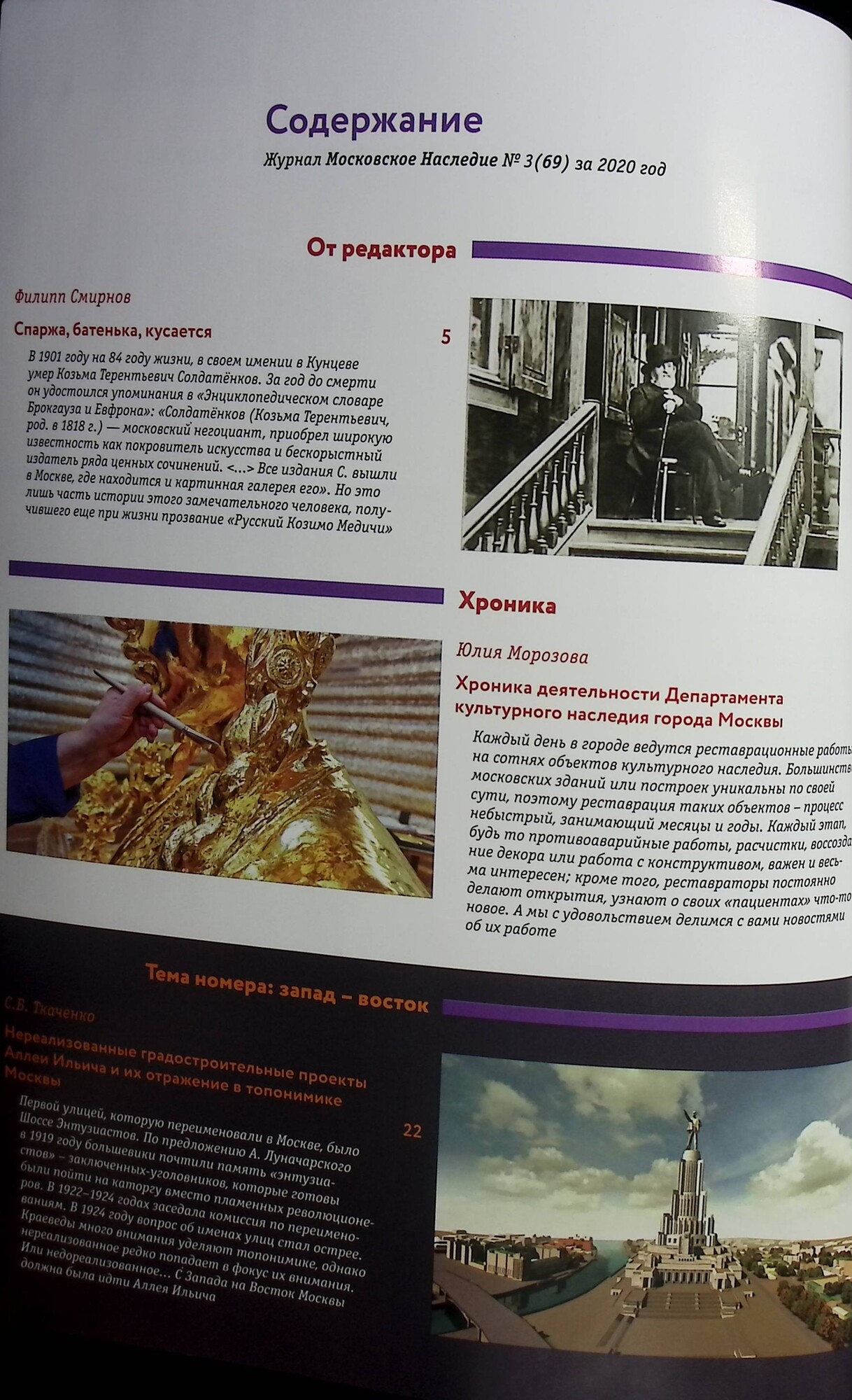 Материал о парковой скульптуры из музея-усадьбы "Кусково", усадьбах на востоке и западе Москвы и прочих выдающихся исторических объектов.Научно-популярный просветительский журнал, выпускаемый с 2006 года при поддержке Правительства Москвы, публикует материалы об истории и новостях архитектуры города, мнения горожан и экспертов о ситуации в сфере обеспечения сохранности объектов культурного наследия, опыте их реставрации и месте в столичных градостроительных планах, уникальные фотографии и современные репортажи, маршруты познавательных культурологических прогулок.