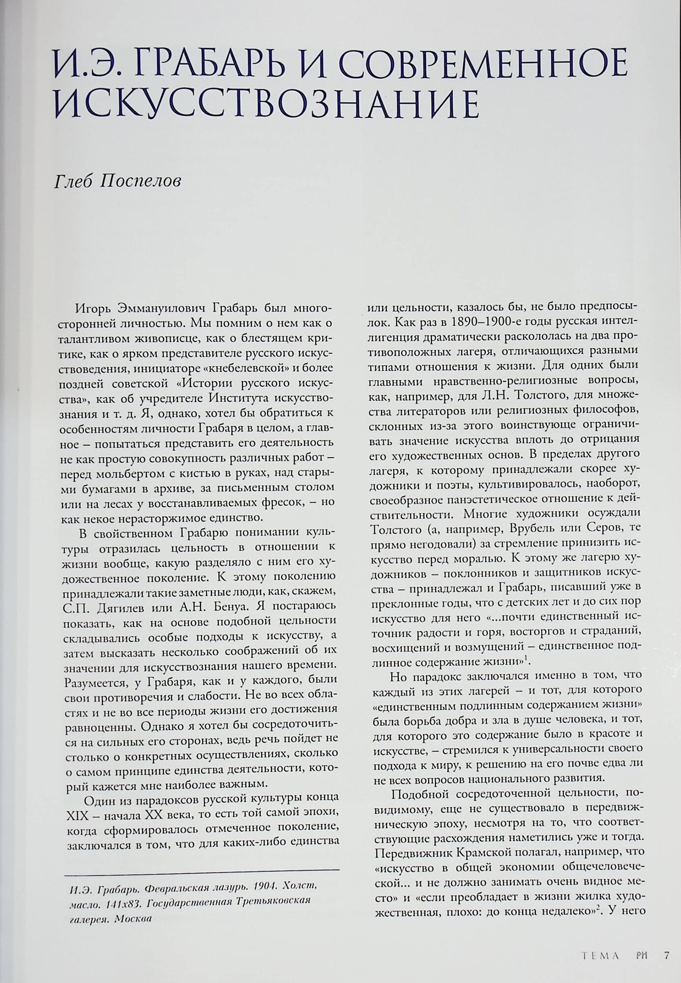 Номер, посвященный И.Э. Грабарю, в равной мере можно считать и юбилейным - в будущем году исполнится 140 лет со дня рождения Игоря Эммануиловича, и мемориальным - вот уже полвека как его не стало. Работа редакции над данным выпуском шла, однако, без привязки к какой-то конкретной дате: он третий (после «третьяковского» и «остроуховского»), логично завершающий ряд монографических номеров, инициированных издателями «Русского искусства» - Благотворительным Фондом имени П.М. Третьякова. В 1913 году И.Э. Грабарь сменяет И.С. Остроухова в должности попечителя Третьяковской галереи, а с 1918 по 1925 год является ее директором. И акцент в этом номере естественным образом ставится на деятельности Грабаря, связанной с жизнью галереи.