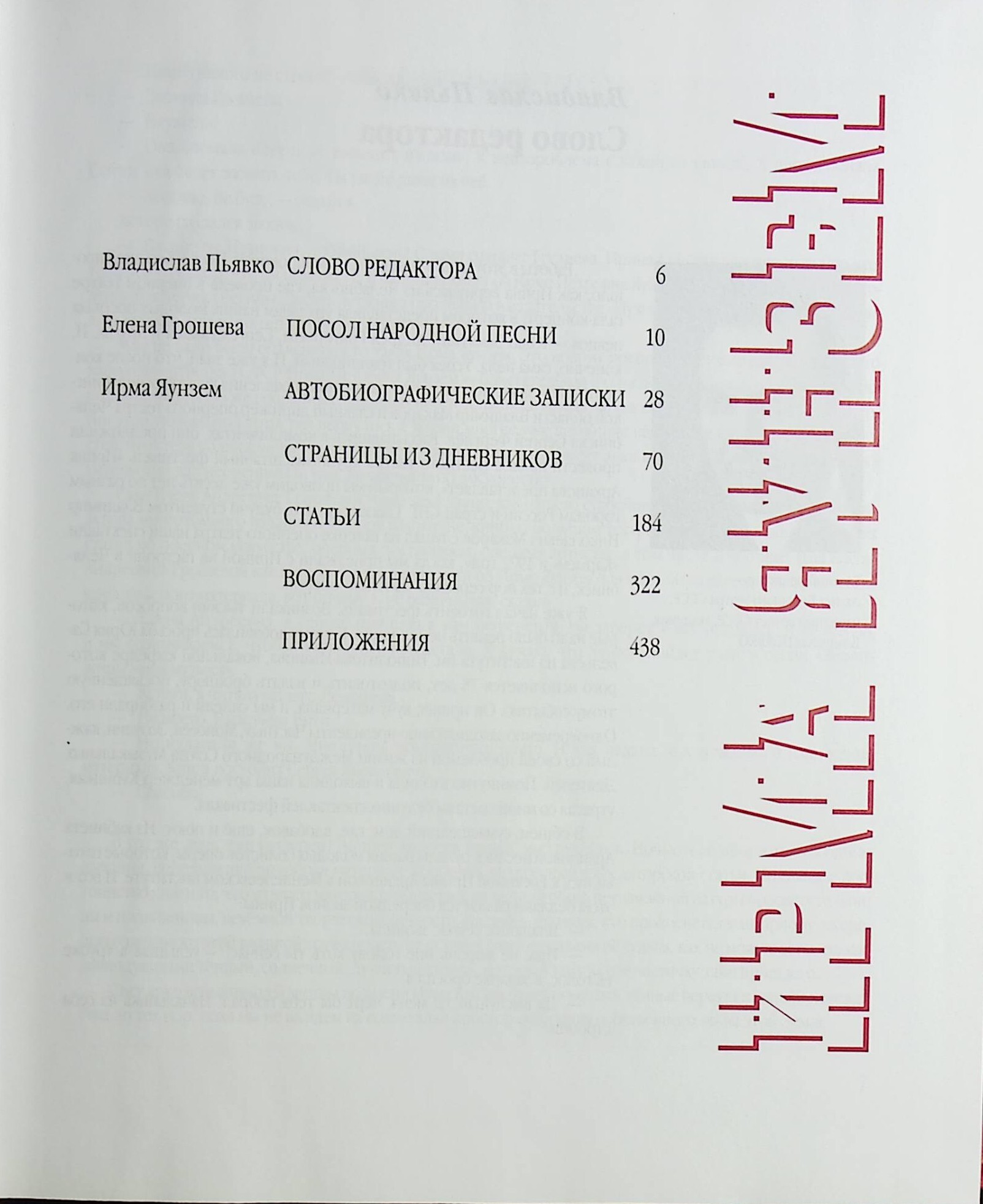 Сборник посвящен выдающейся певице, народной артистке России Ирме Петровне Яунзем (1897-1995), положившей начало собиранию, изучению и широкой пропаганде народных песен почти всех национальностей бывшего Советского Союза и ряда других стран. Помимо материалов самой певицы, в книгу включены статьи видных деятелей искусства, а также воспоминания родных, друзей и учеников.
