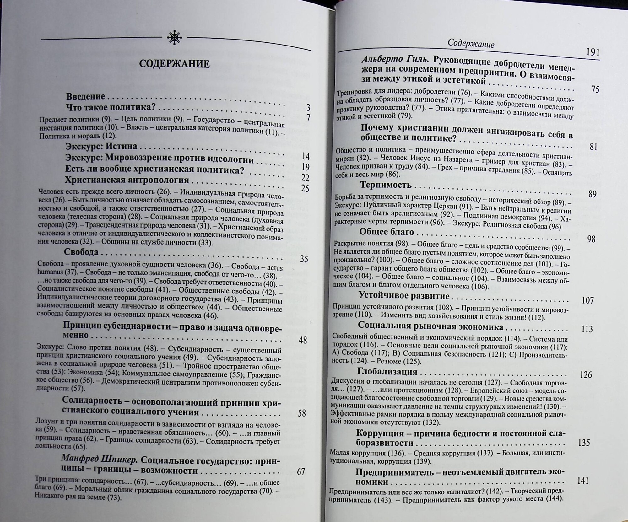 Руководитель фонда "Помощь Церкви в беде" д-р Норберт Нойхауз, исходя из представлений христианской антропологии о сущности человека, о смысле и задаче его жизни, излагает принципы и приоритеты политико-экономического устройства общества с точки зрения христианского социального учения. Основное внимание автор уделяет такому порядку "совместной жизни людей", который создает благоприятные условия для развития личности. В этой связи рассматриваются понятия субсидиарности и солидарности, свободы, общего блага, социальной рыночной экономики, взаимоотношения государства, гражданского общества и различного рода объединений (общин). Автор высказывает свою точку зрения на либеральное общество и на социализм.