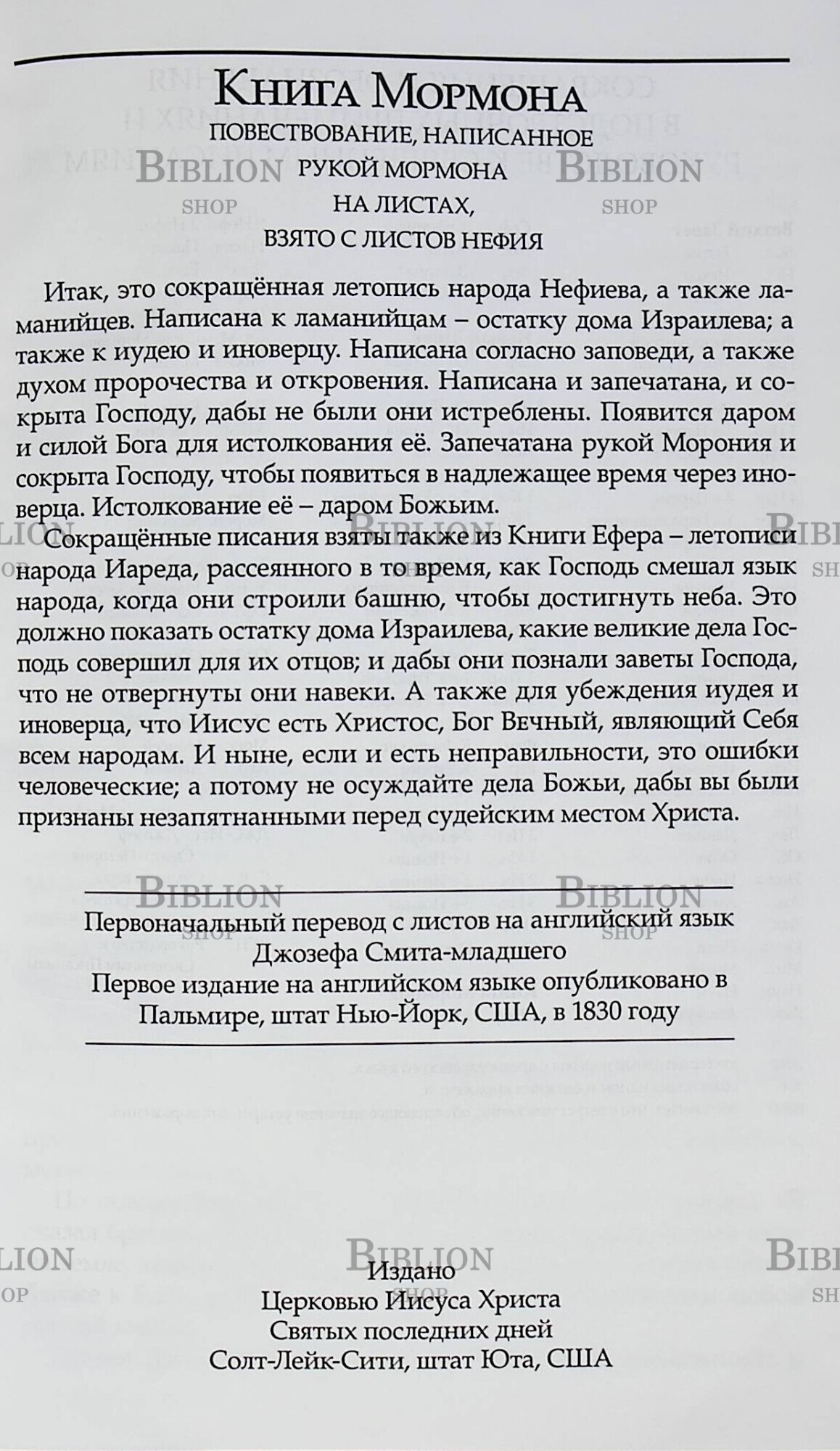 Это сокращенная летопись народа Нефиева, а также ламанийцев. Написана она к ламанийцам - остатку дома Израилева; а также к Иудею и к иноверцу. Написана согласно заповеди, а также духом пророчества и откровения. Написана и запечатана, и сокрыта Господу, дабы не были они истреблены. Появится даром и силой Бога для истолкования её. Запечатана рукой Морония и сокрыта Господу, чтобы появиться в надлежащее время через иноверца. Истолкование её - даром Божьим. Сокращенные писания взяты также из Книги Ефера-летописи народа Иареда, рассеянного в то время, как Господь смешал язык народа, когда они строили башню, чтобы достигнуть неба. Это должно показать остатку дома Израилева, какие великие дела совершил Господь для их отцов, и дабы они познали заветы Господа , что не отвергнуты они навеки; а также для убеждения иудея и иноверца, что Иисус есть Христос, Бог Вечный, являющий Себя всем народам. И ныне, если и есть неправильности, это - ошибки человеческие, а потому не осуждайте дела Божии, дабы вы были признаны незапятнанными перед судейским местом Христа.