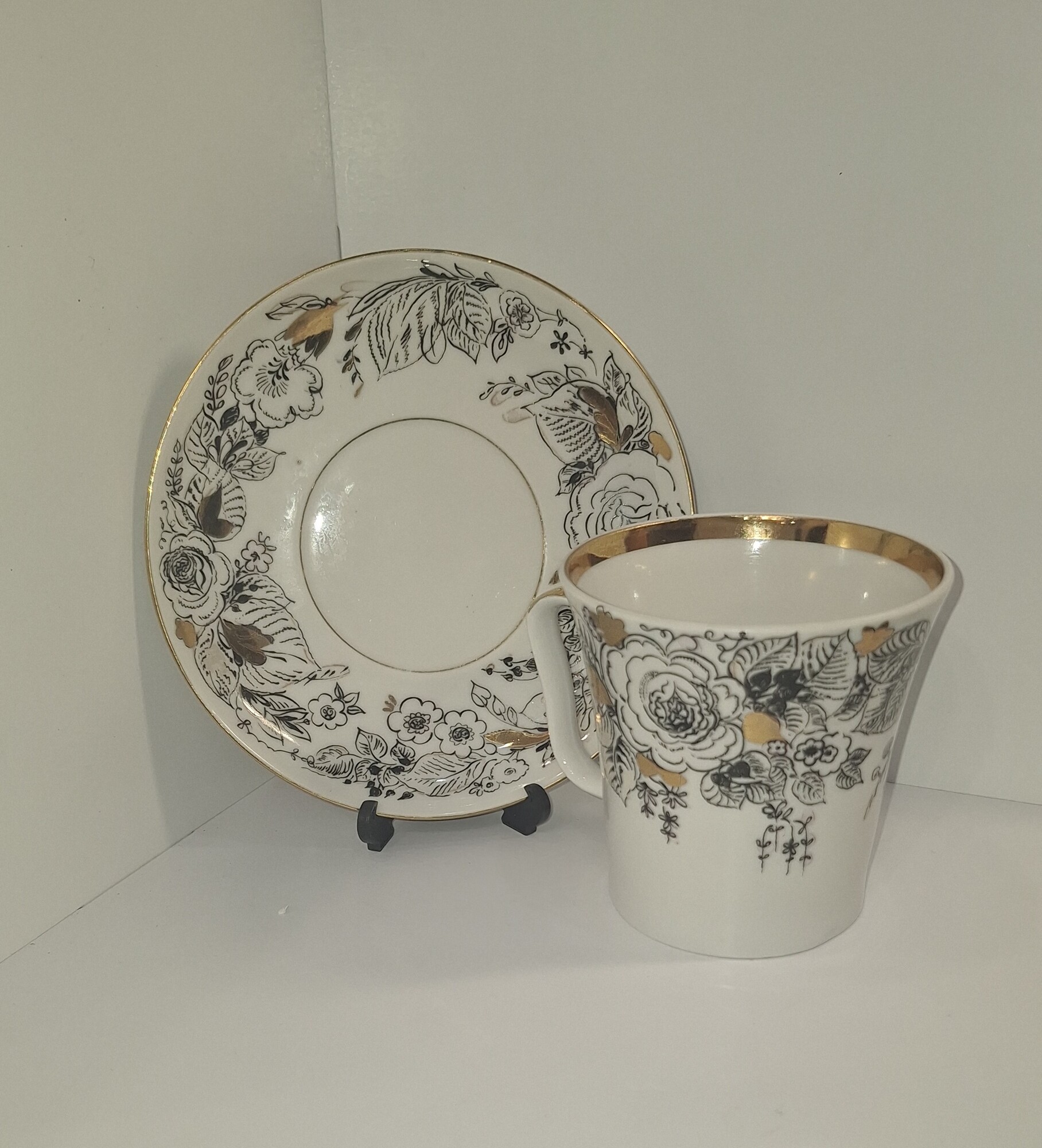 Винтажная чайная пара ЛФЗ "Розы", (форма "Ленинградский"), фарфор, деколь, золочение, Ленинградский фарфоровый завод (ЛФЗ), СССР 1970-е гг