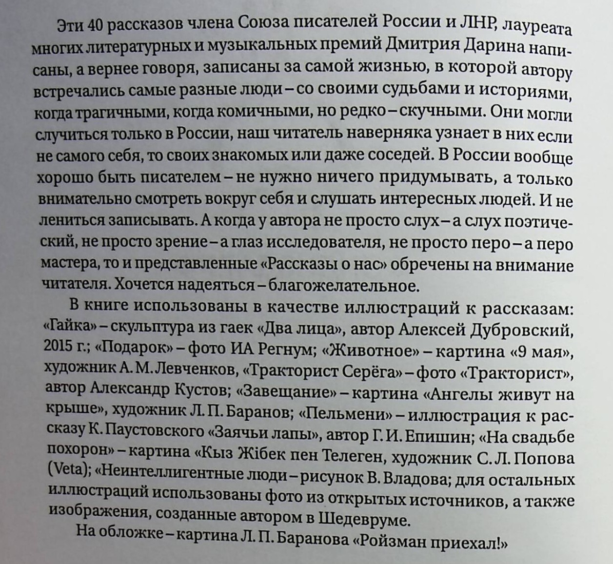 Эти 40 рассказов члена Союза писателей России и ЛНР,лауреата многих литературных и музыкальных премий Дмитрия Дарина написаны, а вернее говоря,записаны за самой жизнью, в которой автору встречались самые разные люди-со своими судьбами и историями,когда трагичными ,когда комичными, но редко- скучными.