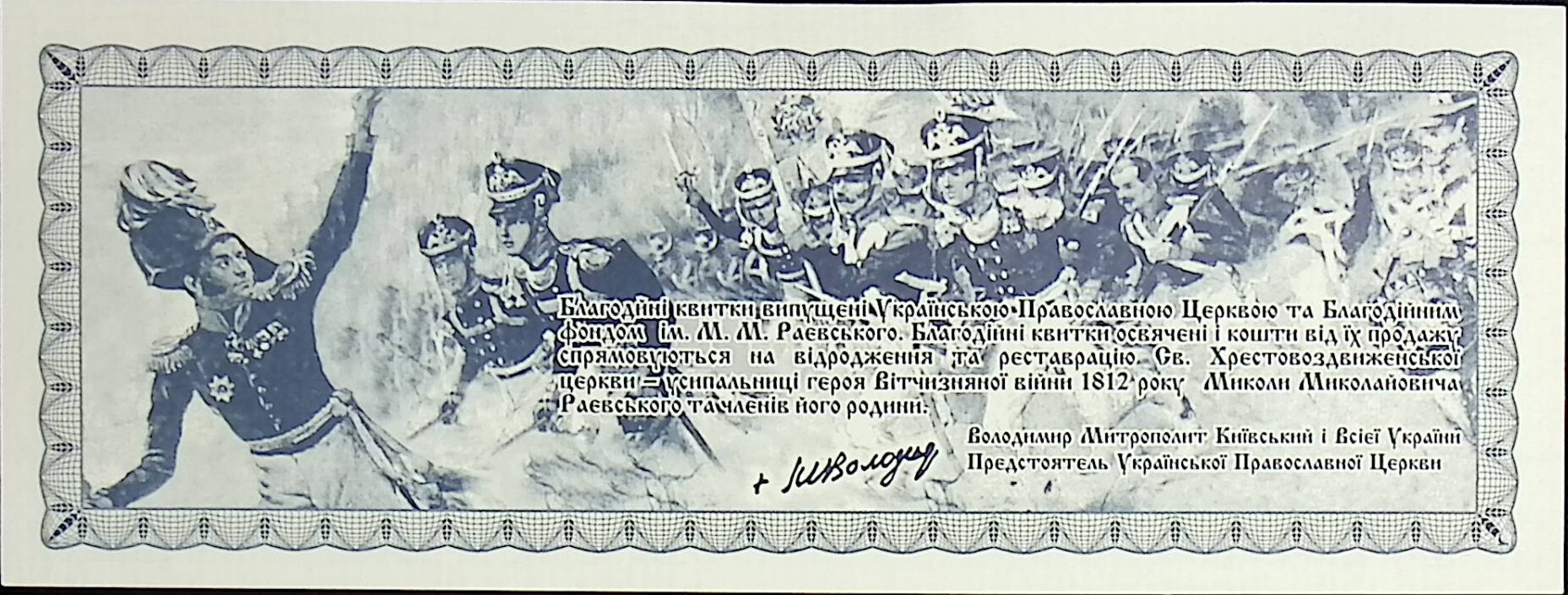 Благотворительный билет выпущен Украинской Православной Церкви Благотворительном фондом им. М.М. Раевского .
