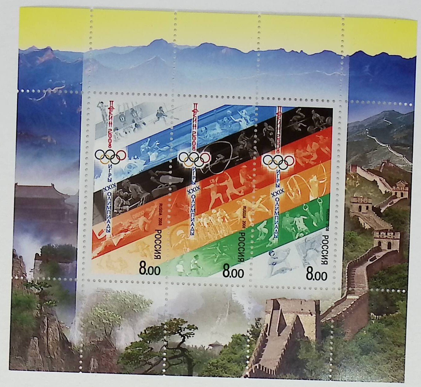 Игры XXIX Олимпиады пройдут в Пекине, столице Китайской Народной Республики с 8 по 24 августа 2008 года. Пекин был избран столицей XXIX Олимпиады 13 июля 2001 года на 112-й сессии Международного олимпийского комитета в Москве. Его конкурентами были Торонто (Канада), Париж (Франция), Стамбул (Турция) и Осака (Япония). Талисманами Олимпиады станут Дети удачи. Согласно китайской философии, Детей удачи пятеро: Бэй-Бэй, Цзин-Цзин, Хуань-Хуань, Ин-Ин и Ни-Ни. Они также воплощают в себе рыбу, большую панду, огонь, тибетскую антилопу и ласточку. Если сложить первые слоги имени каждого из них, то получится фраза, перевод которой означает – «Добро пожаловать в Пекин!» На марках изображены олимпийские виды спорта и олимпийская символика на фоне полос, повторяющих цвета олимпийских колец. На полях блока – горный пейзаж Китая и Великая Китайская стена.