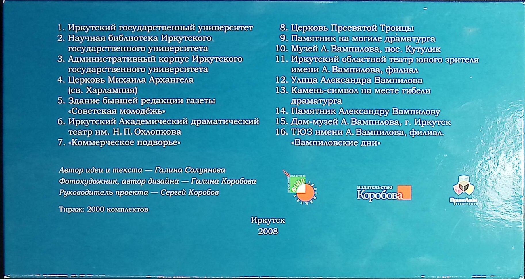 Набор из 16 открыток. Издан в 2008 году издательством Коробова в Иркутске.